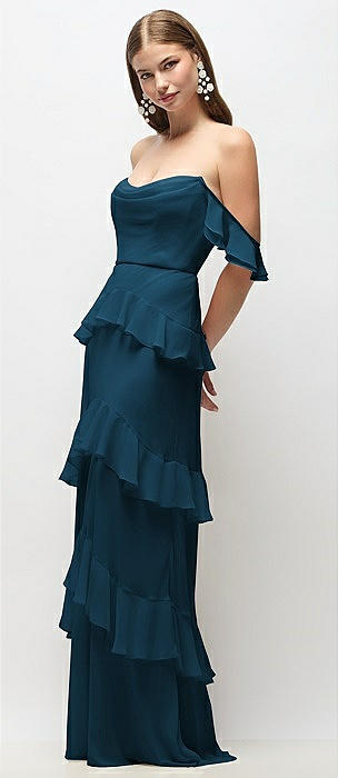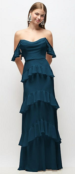 Off-the-Shoulder Cowl Chiffon Tiered Ruffle Maxi Dress with Convertible Ruffle Straps in atlantic blue