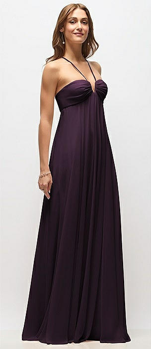Empire Waist Chiffon Halter Maxi Dress with Convertible Spaghetti Straps in aubergine