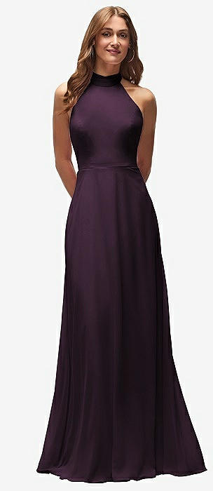 Shirred Skirt Jewel Neck Halter Dress with Front Slit in aubergine