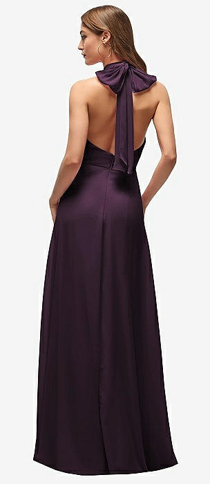 Shirred Halter Chiffon Maxi Dress with Back Sash-Tie Closure in aubergine