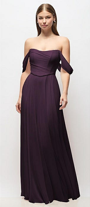 Off-the-Shoulder Basque Corset Chiffon Maxi Dress in aubergine