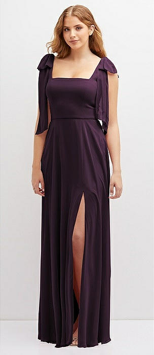 Bow Shoulder Square Neck Chiffon Maxi Dress in aubergine