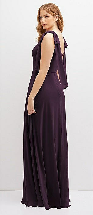 Bow-Shoulder V-Back Chiffon Gown with Front Slit in aubergine