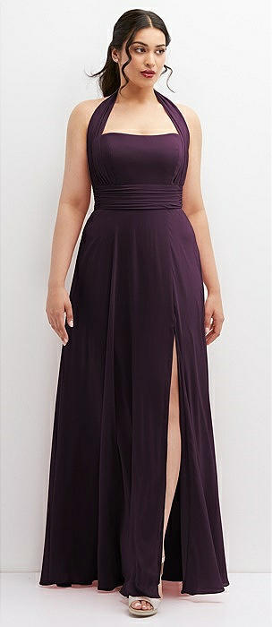 Shirred Skirt Jewel Neck Halter Dress with Front Slit in aubergine