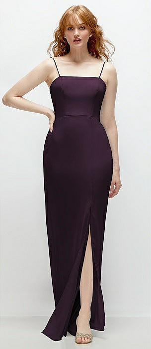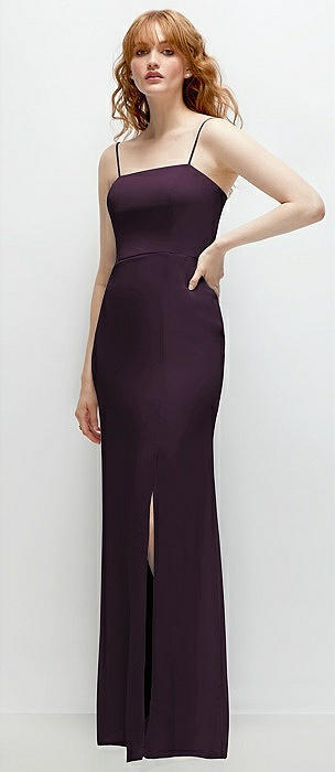 Spaghetti Strap Draped Skirt Gown with Front Slit in aubergine