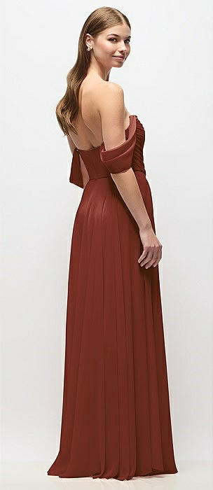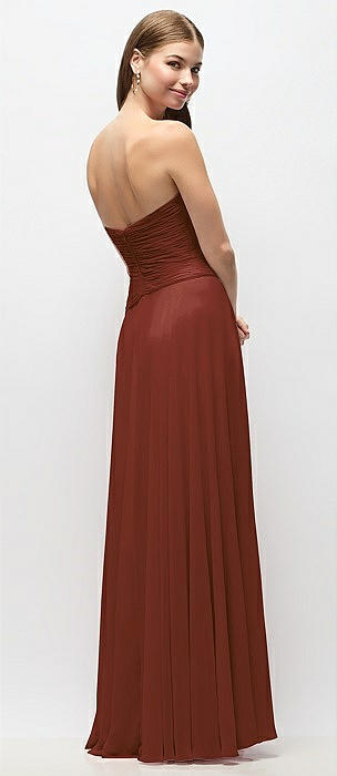 Strapless Chiffon Maxi Dress with Asymmetrical Ruched Drop Waist in auburn moon