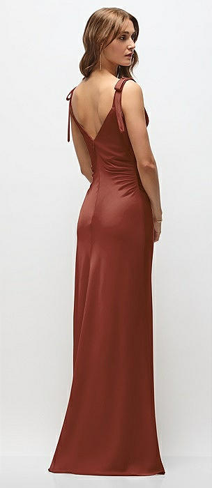 Soft Cowl Neck Ruched Side Satin Bias Maxi Dress with Shoulder Bows in auburn moon