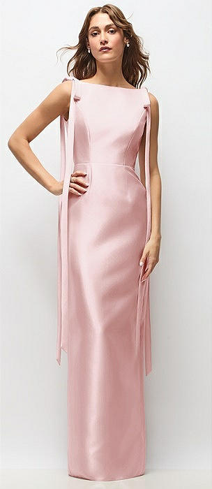 Bateau Neck Satin Column Maxi Dress with Exaggerated Tail Bow Straps in ballet pink