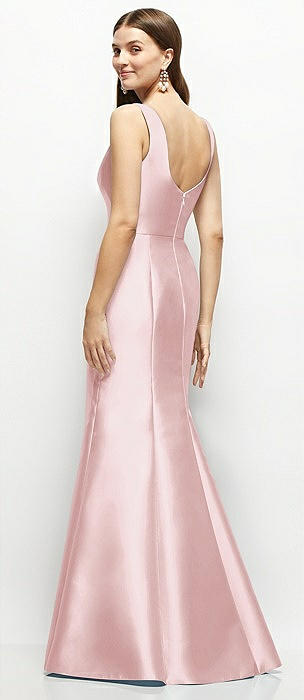 Deep V-back Satin Trumpet Dress with Cascading Bow at One Shoulder in ballet pink