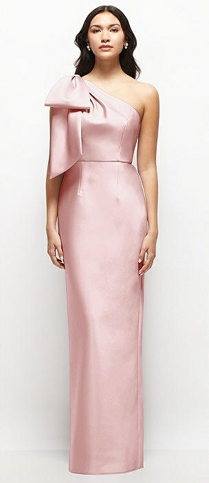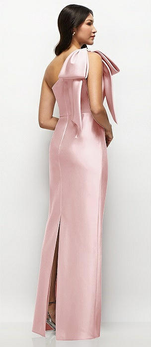 Oversized Bow One-Shoulder Satin Column Maxi Dress in ballet pink