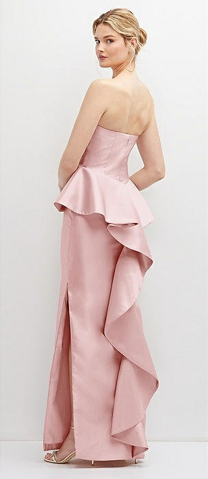 Strapless Satin Maxi Dress with Cascade Ruffle Peplum Detail in ballet pink