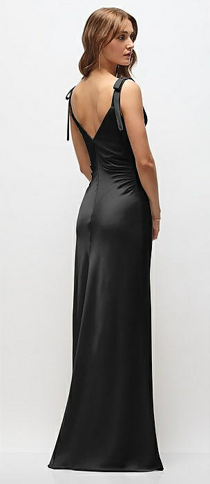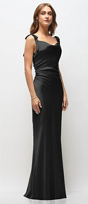 Soft Cowl Neck Ruched Side Satin Bias Maxi Dress with Shoulder Bows in black