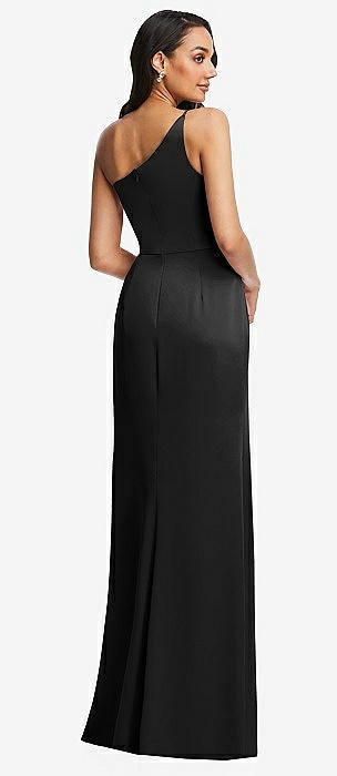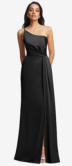 Draped One-Shoulder Satin Trumpet Gown with Front Slit in black