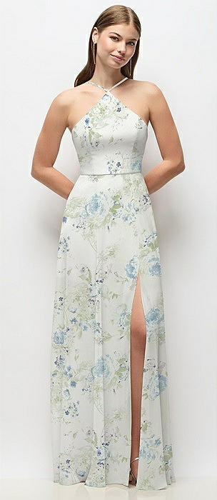 High-Neck Halter Floral Chiffon Maxi Dress with Adjustable Spaghetti Straps in bleu garden