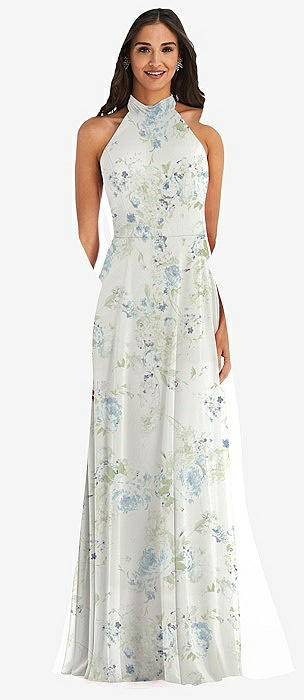 Shirred Skirt Jewel Neck Halter Dress with Front Slit in bleu garden