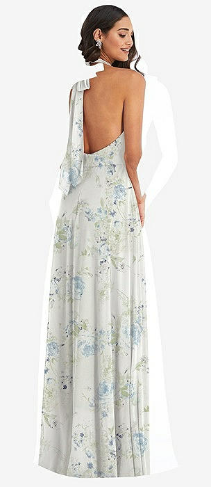 Shirred Halter Chiffon Maxi Dress with Back Sash-Tie Closure in bleu garden