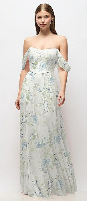Off-the-Shoulder Basque Corset Floral Chiffon Maxi Dress in bleu garden