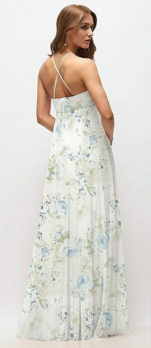 Empire Waist Floral Chiffon Halter Maxi Dress with Convertible Spaghetti Straps in bleu garden