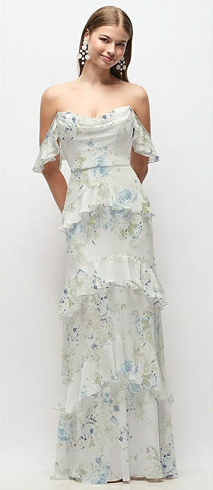 Off-the-Shoulder Cowl Floral Chiffon Tiered Ruffle Maxi Dress with Convertible Ruffle Straps in bleu garden