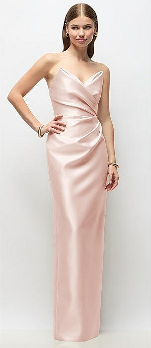 Strapless Asymmetrical Draped Satin Column Maxi Dress in blush