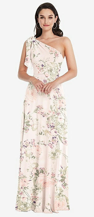 One-Shoulder Chiffon Maxi Dress with Shirred Front Slit in blush garden