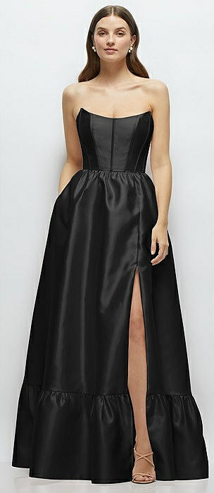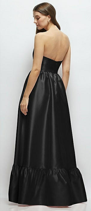 Strapless Draped Skirt Satin Maxi Dress with Cascade Ruffle in black