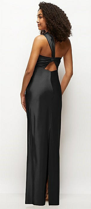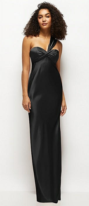 Satin Twist Bandeau One-Shoulder Bias Maxi Dress in black