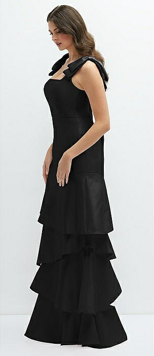 Bow-Shoulder Satin Maxi Dress with Asymmetrical Tiered Skirt in black