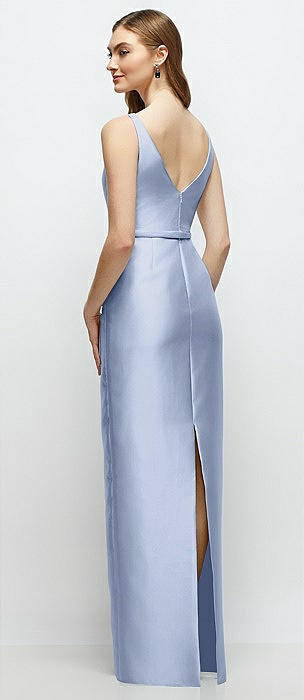 Bateau Neck Satin Column Dress with Bow-Trimmed Skinny Belt in sky blue