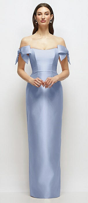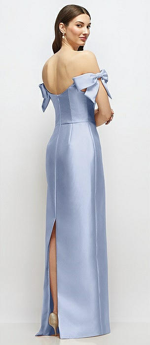 Basque-Neck Satin Column Maxi Dress with Off-the-Shoulder Bows in sky blue