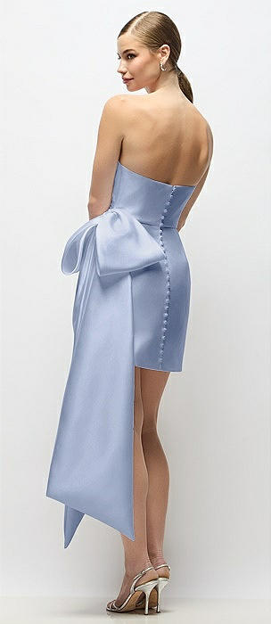 Strapless Pleated Draped Satin Mini Dress with Dramatic Long Tail Bow & Covered Buttons