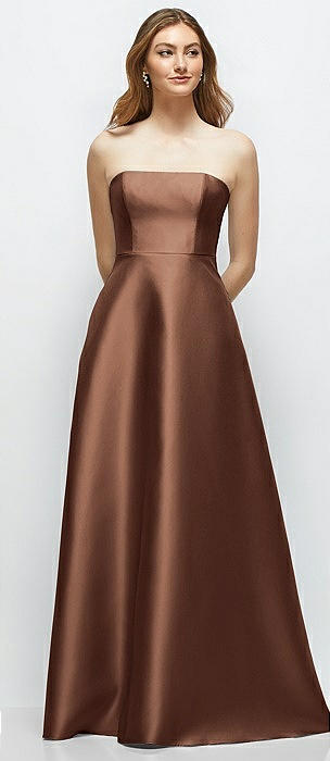 Strapless Satin Drop Waist Gown with Full Skirt in cognac