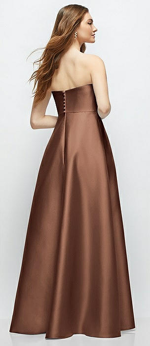 Strapless Satin Gown with Full Skirt and Covered Buttons at Back in cognac