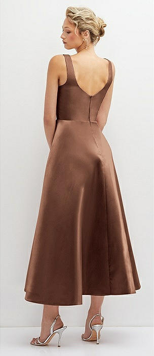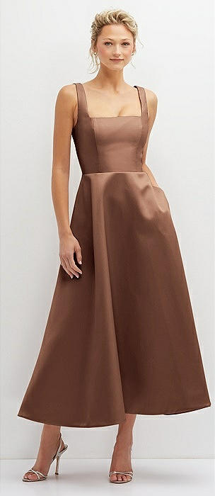 Square Neck Satin Midi Dress with Full Skirt & Pockets in cognac
