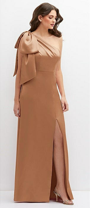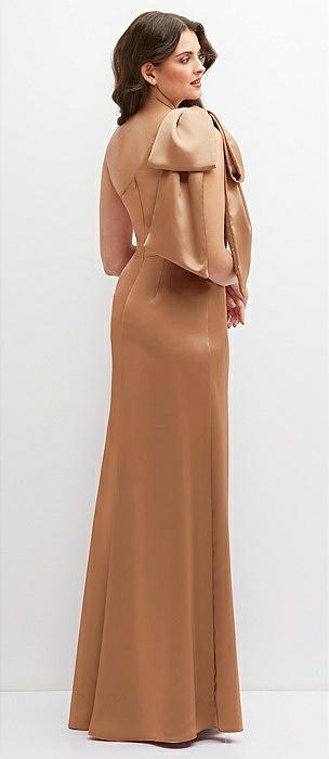 Cascading Bow One-Shoulder Stretch Satin Mermaid Dress with Slight Train in cognac