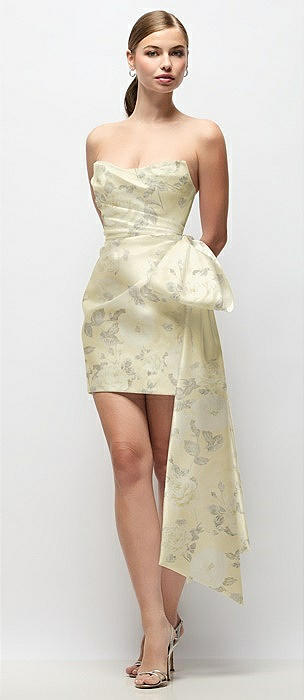 Strapless Pleated Draped Floral Satin Mini Dress with Dramatic Long Tail Bow & Covered Buttons in butter yellow floral