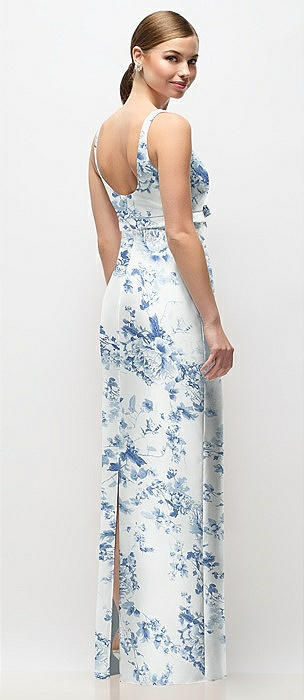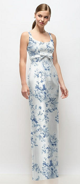 Scoop Neck Floral Satin Column Maxi Dress with Bow at Empire Waist in porcelain blue seraphina floral