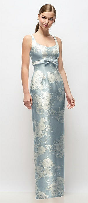 Scoop Neck Floral Satin Column Maxi Dress with Bow at Empire Waist in bow and blossom print