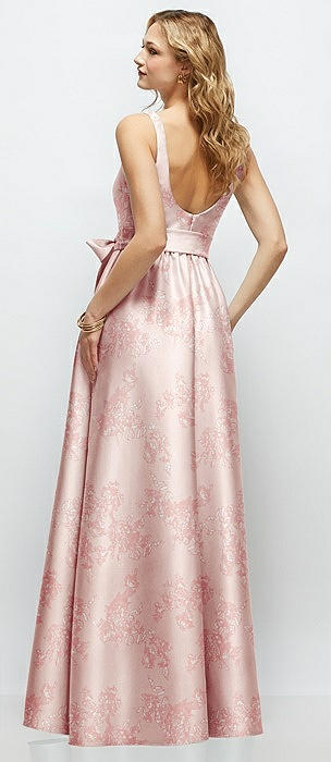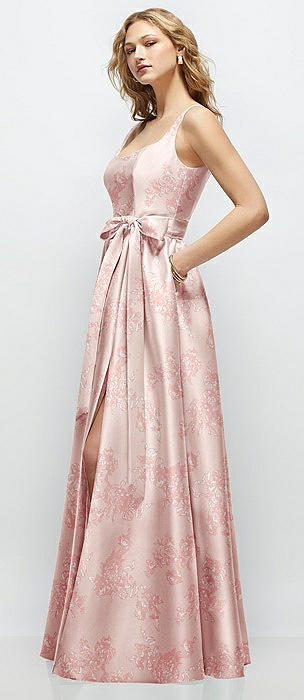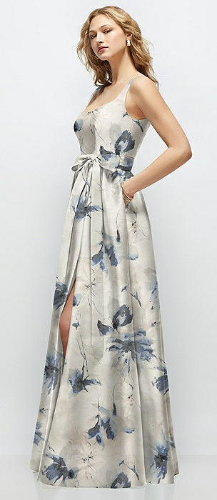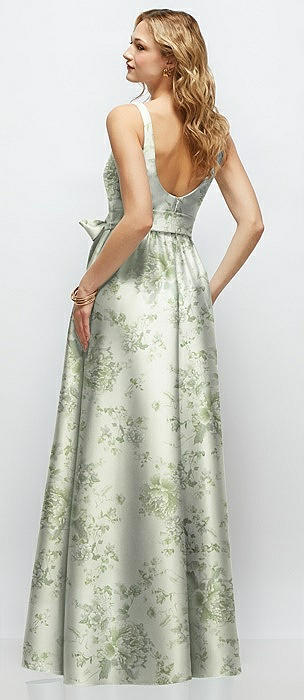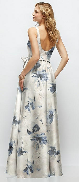 Floral Strapless Satin Drop Waist Gown with Full Skirt in bow and blossom print