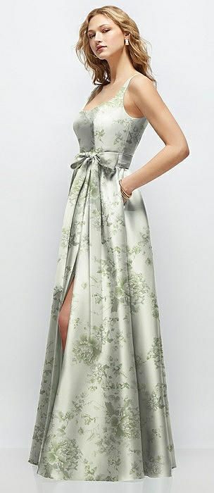Floral Strapless Satin Drop Waist Gown with Full Skirt in sage cottage rose