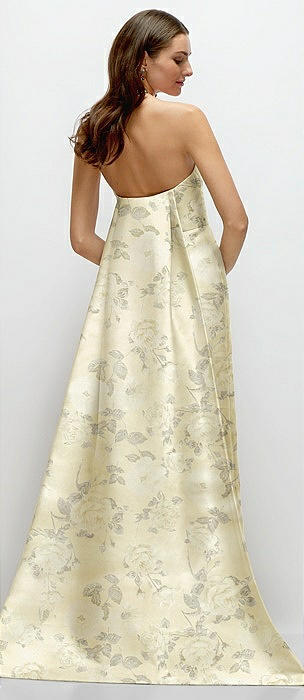 Strapless Floral Satin Column Dress with Removeable Watteau Train in butter yellow floral