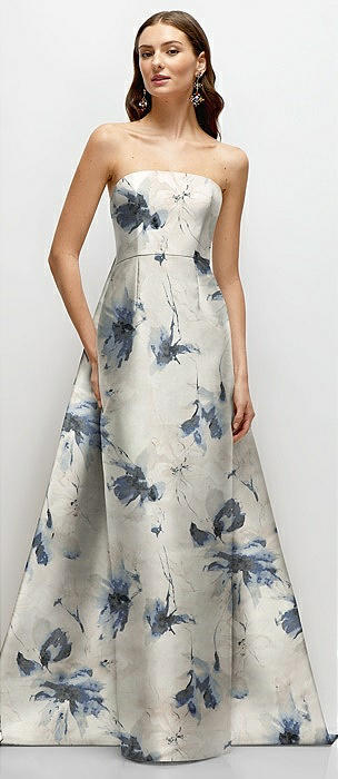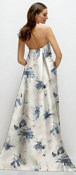 Strapless Floral Satin Column Dress with Removeable Watteau Train in inkwash blue floral