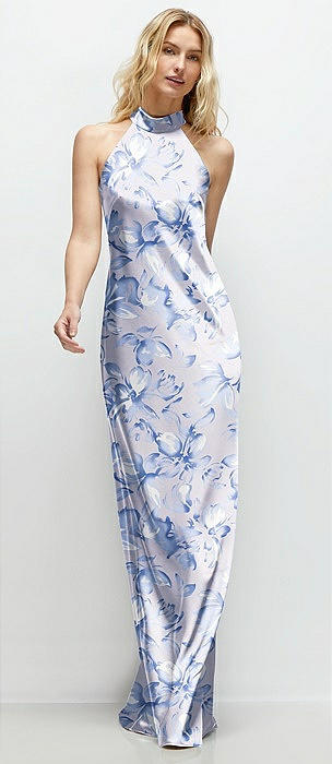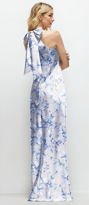 Floral Stand Collar Bias Satin Maxi Dress with Self-Tie Bow Back in magnolia sky