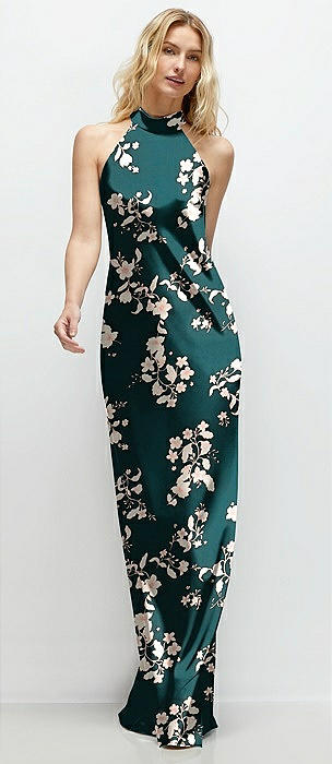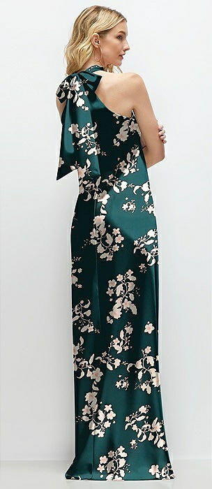 Floral Stand Collar Bias Satin Maxi Dress with Self-Tie Bow Back in vintage primrose evergreen