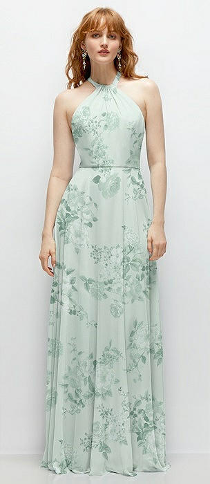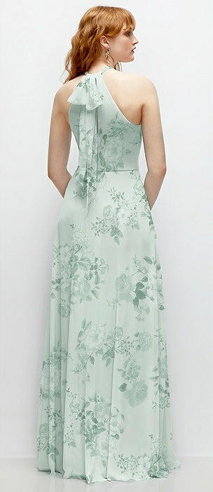 Shirred Halter Chiffon Maxi Dress with Back Sash-Tie Closure in mint green floral