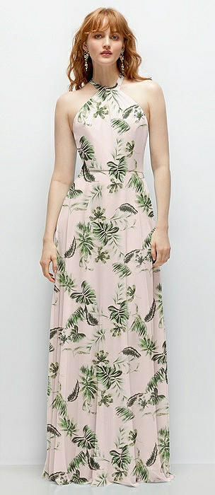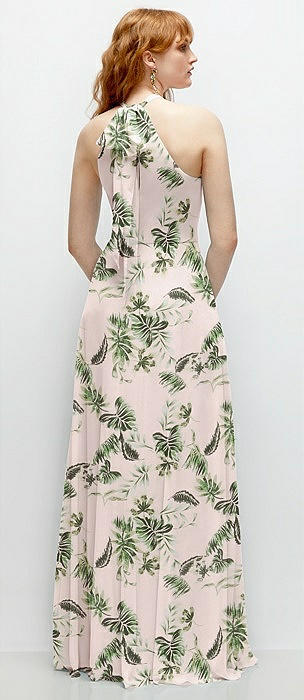 Shirred Halter Chiffon Maxi Dress with Back Sash-Tie Closure in palm beach print