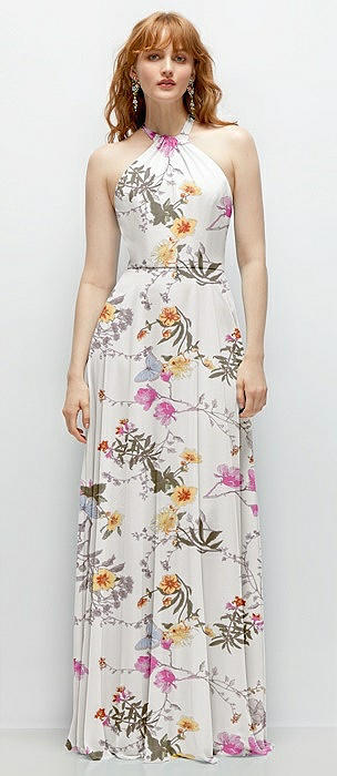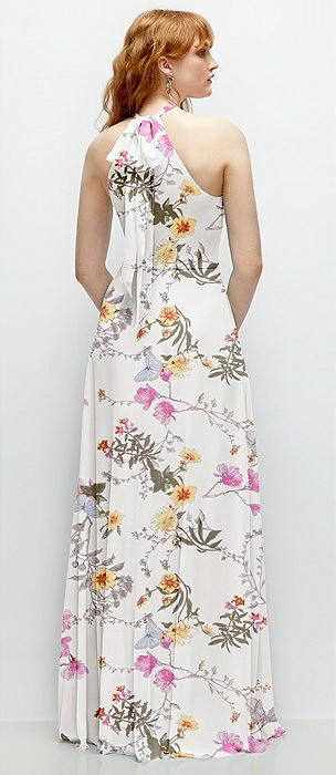Shirred Halter Chiffon Maxi Dress with Back Sash-Tie Closure in butterfly botanica ivory