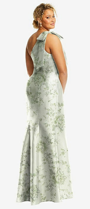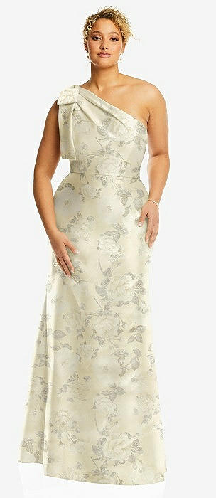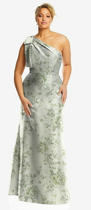 Bow One-Shoulder Floral Satin Trumpet Gown in sage cottage rose