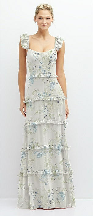 Tiered Chiffon Maxi A-line Dress with Convertible Ruffle Straps in mint green floral