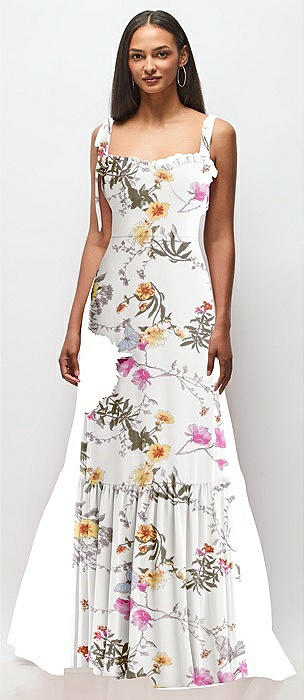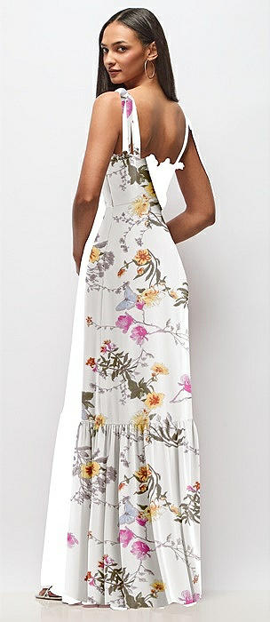 Tie-Shoulder Bustier Bodice Ruffle-Hem Maxi Dress in butterfly botanica ivory